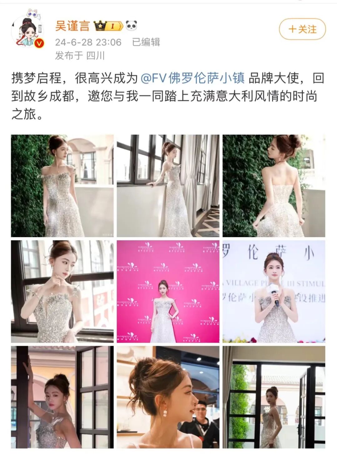 吴谨言的代言相较王星越而言,少一些,新增只有1个。在剧集收官当天,她被官宣为佛罗伦萨小镇的品牌大使。