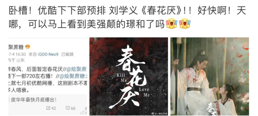 影视方面,优酷生花剧场公布的新剧集中,吴谨言的《春花厌》在列,搭档的男主角是刘学义,据悉又是美强癫的设定。吴谨言果然是闯出了一条爽文大女主赛道啊。