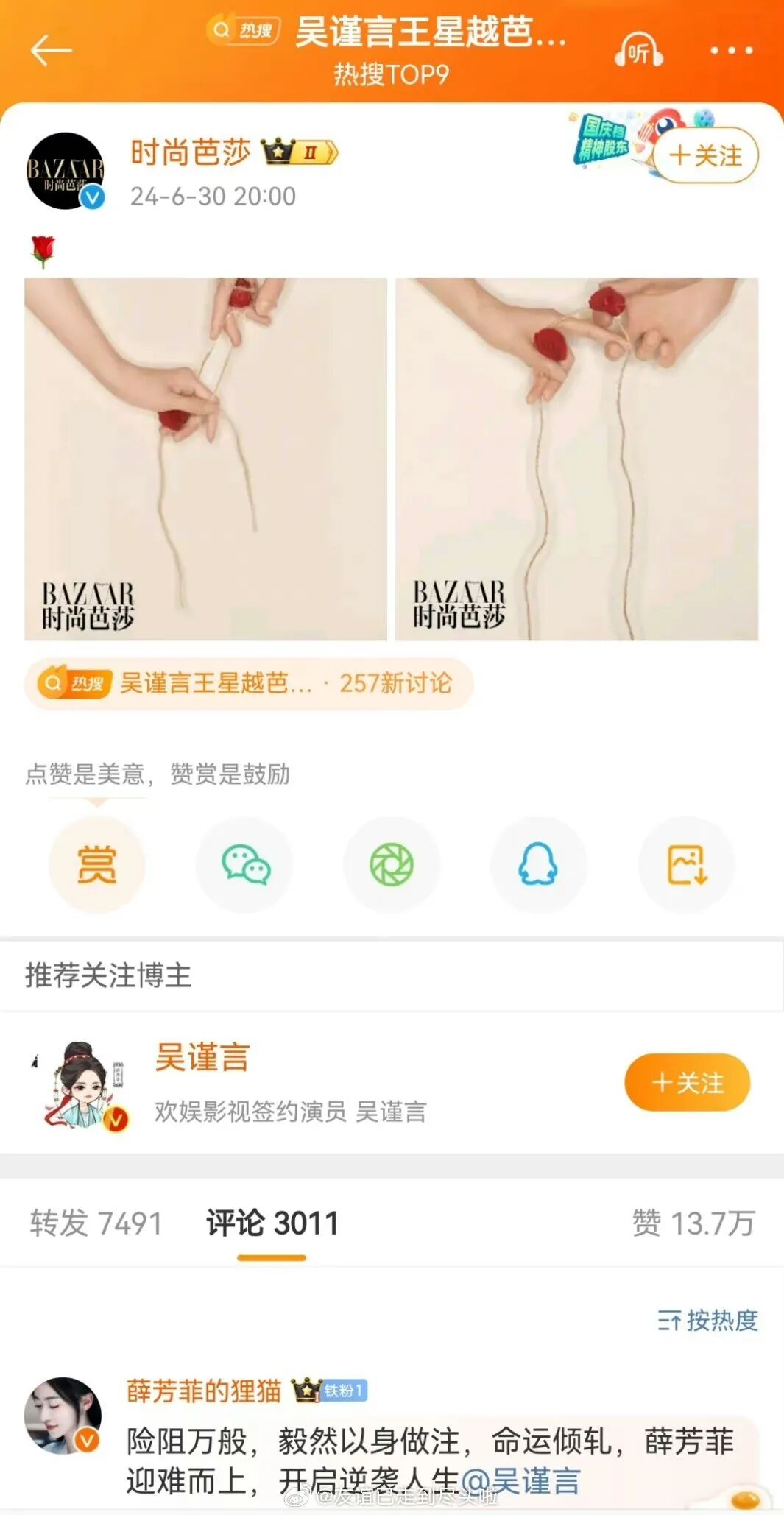 值得一提的是,6月30号和王星越一起参与了业内著名“婚庆公司”芭莎杂志的拍摄,这让CP粉激动万分。