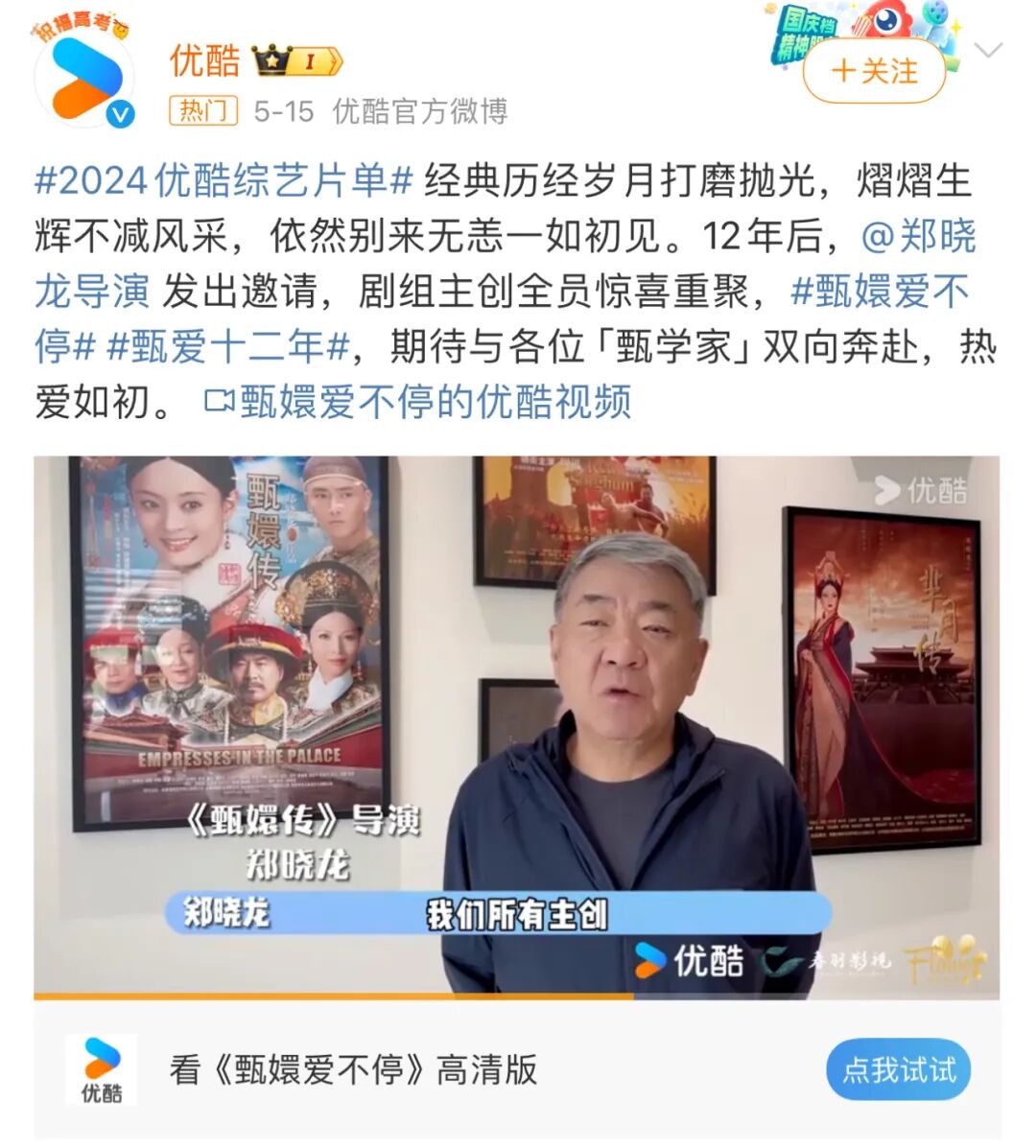 在其五月中旬更新2024综艺片单中,一档《甄嬛爱不停》曾高调地引起了网友的关注,从片名,再到由《甄嬛传》导演郑晓龙出面发起,可以验证这是《甄嬛传》的真·团综。节目主打“剧组主创全员惊喜重聚”,官方提出“与甄学家双向奔赴”的口号,还放出了郑晓龙为这档节目录制的视频。