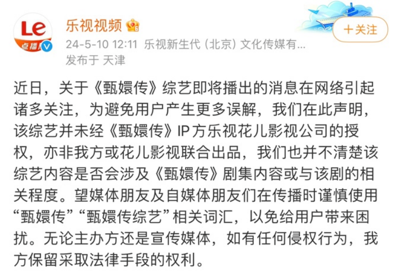 乐视先表明了自己的版权方正主身份,不提《焕新环游传》节目名,但打假无授权的“该综艺”意指明显,打的就是它这自封的“钮祜禄·鹅”家。鹅最终在节目中要如何炒起《甄嬛传》剧集相关话题,乐视作为版权方虽然对此不了解,但态度已经表明——鹅家这档没有经过授权的节目,不能任意使用“甄嬛传”“甄嬛传综艺”的话题进行宣传。