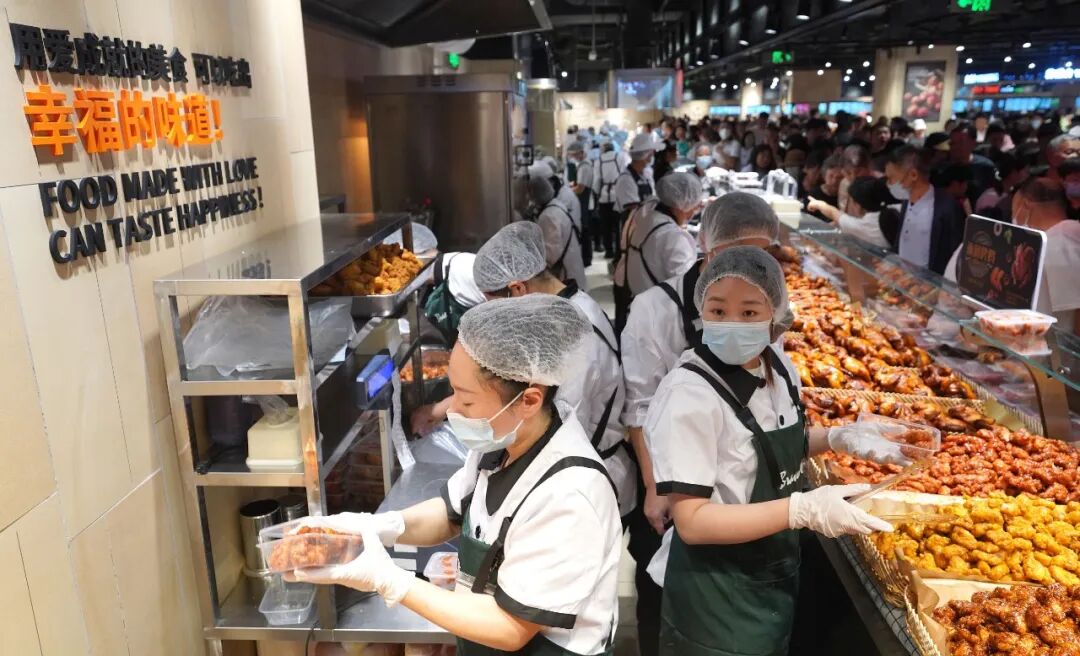 我看的两个店,涵盖了超市、珠宝、电影、电玩、餐饮、电器、百货等业态,有不少自有品牌、网红商品,如胖东来大月饼,每人最多买6个。