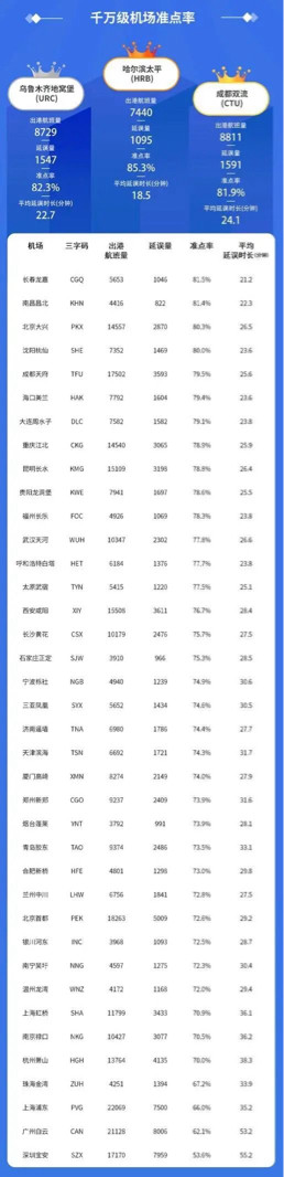 根据航班管家App发布的《雷雨季航班准点率月报》,8月,千万级机场中,哈尔滨太平机场准点率最高,出港航班量共计7440架次,准点率达到85.3%,其次是乌鲁木齐地窝堡和成都双流。