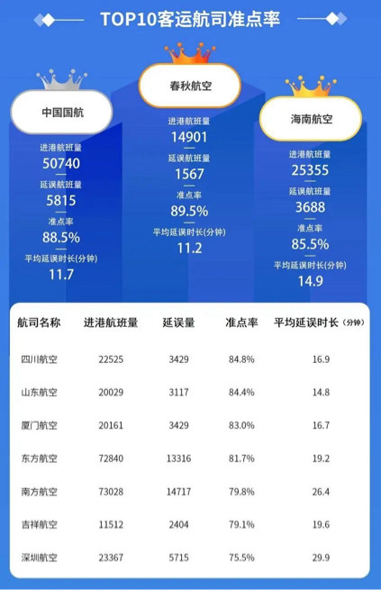 航班量十大客运航司中,春秋航空准点率最高,进港航班量共计14901架次,准点率达到89.5%,其次是中国国航和海南航空。