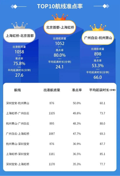 航班量十大客运航线中,首都北京—上海虹桥准点率高,出港航班量共计1052架次,准点率为80%。