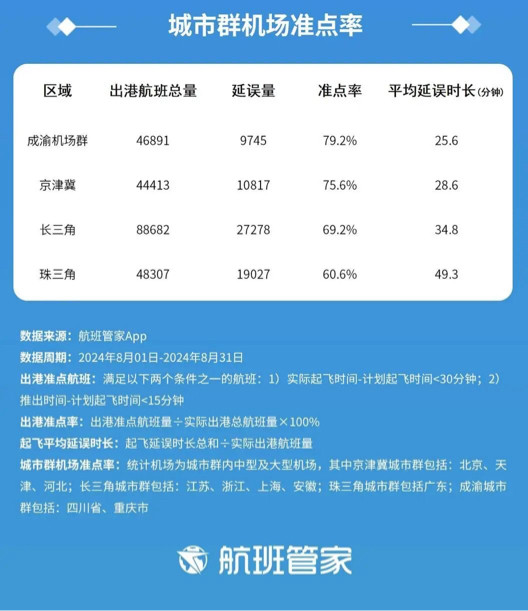 城市群机场准点率:统计机场为城市群内中型及大型机场,其中京津冀城市群包括:北京、天津、河北;长三角城市群包括:江苏、浙江、上海、安徽;珠三角城市群包括:广东;成渝城市群包括:四川省、重庆市。