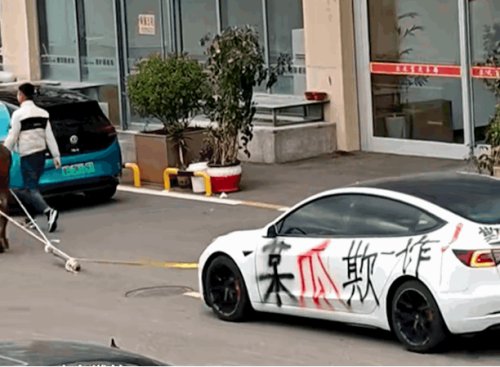 网传图片中,这辆白色的特斯拉Model 3被一头黄牛牵引着,车身上有“某瓜欺诈”的字样。