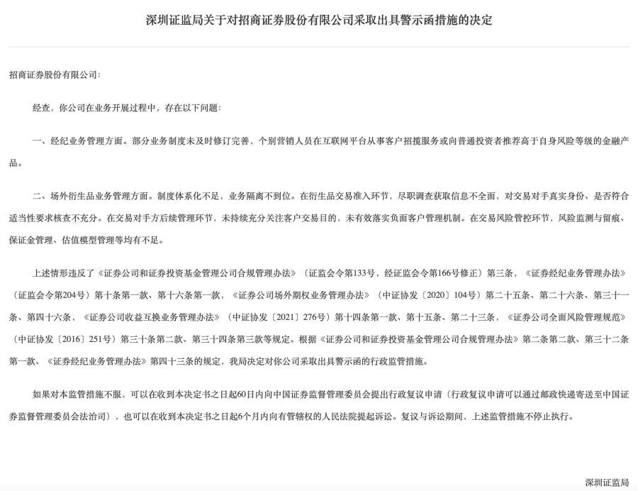 蓝鲸新闻12月21日讯(记者 王婉莹)日前,深圳证监局对招商证券出具警示函,指向其经纪业务、场外衍生品业务。