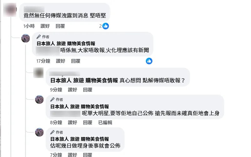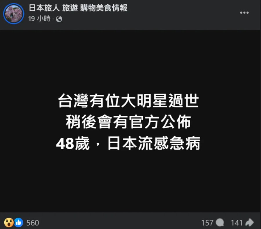拥有2.4万粉丝的Facebook专页“日本旅人 旅游 购物美食情报”突然发文称:“台湾有位大明星过世,稍后会有官方公布,48岁,日本流感急病。”