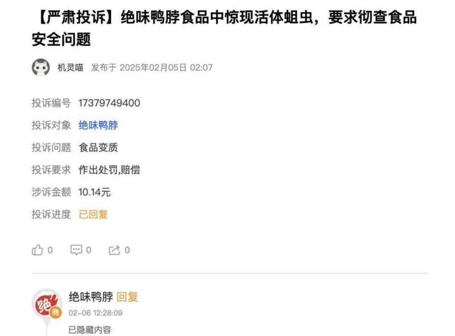 在黑猫投诉以“绝味”关键词进行搜索,有13754条投诉,2月9日有消费者投诉在绝味鸭脖线下消费店买的鸭肠变质,并且有绿色脓包,当时就吐了,但是售卖商家称却称没有问题。也有消费者称:“我于(2024年)12月3日18点30分在绝味鸭脖大话南门店购买了22块钱鸭脖,赠送了一点毛豆,毛豆我尝了三个,吃着明显是坏的,我就把毛豆扔了。鸭脖调料味比较重,当时没吃出来是不新鲜的,所以全吃完了,第二天早上起来就拉肚子了。”