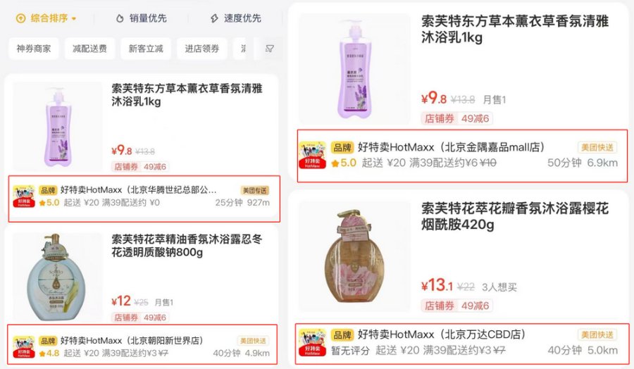 此外,记者通过美团外卖平台搜索发现,目前索芙特在即时零售领域铺货较多的渠道,是折扣店品牌好特卖(HotMaxx),但销量都仅为个位数。