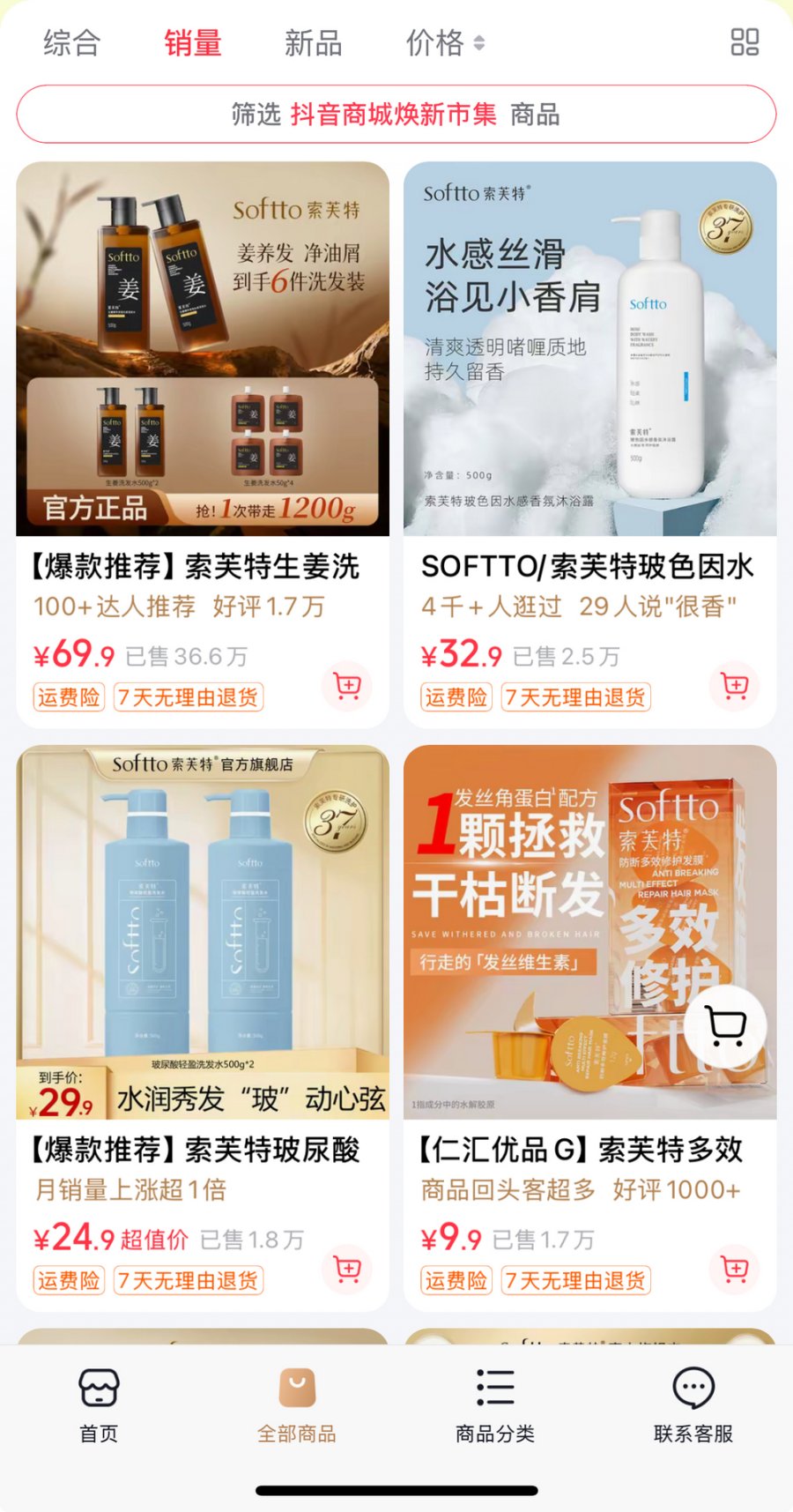 唯一表现亮眼的是其抖音渠道,索芙特抖音官方店铺粉丝虽只有3.9万,但店铺累计销量已超148.7万。其中,69.9元两瓶500g的生姜洗发水销量最高,已售出36.6万件,能看出其主要依靠爆品策略。