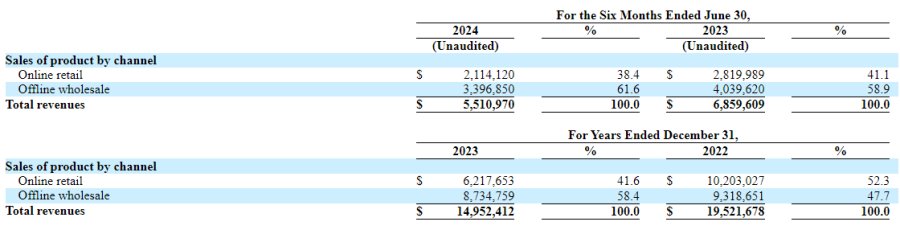 索芙特招股书数据,也印证了这一困境:索芙特SKU不足30个,研发投入仅占收入的2.3%,2024年上半年,索芙特线上、线下销售额持续下滑,分别约为210万美元及340万美元,而线上收入占比从2022年的52.3%降至2024年上半年的38.4%。