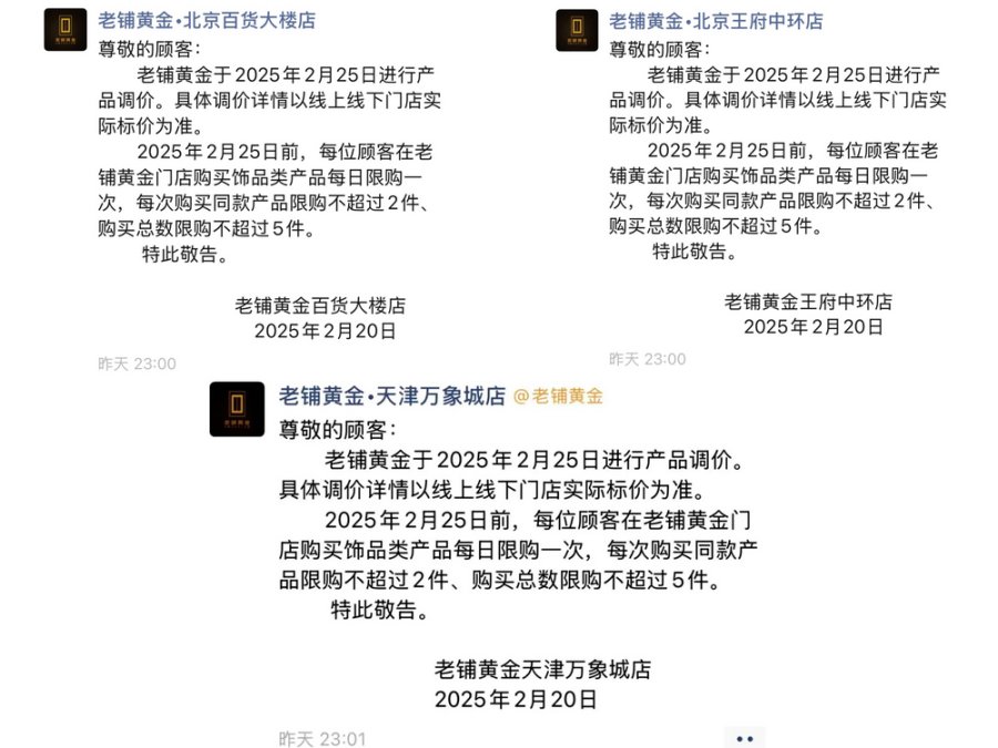 还没等大家消停下来,紧接着,老铺黄金北京百货大楼店、王府井中环店、天津万象城店也都在企业微信朋友圈同步发布了相同的调价、限购通知。