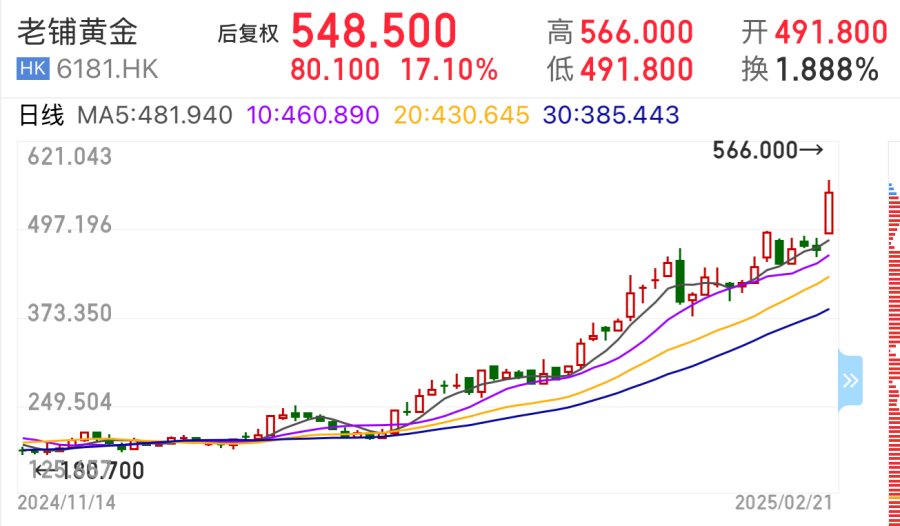 而另一边,资本市场的狂欢也在同步上演:老铺黄金(6181.HK)股价2月21日单日盘中暴涨20.84%,股价最高达566港元/股。截至收盘,股价报收548.5港元/股,市值突破923亿港元,将周大福远远甩在身后。