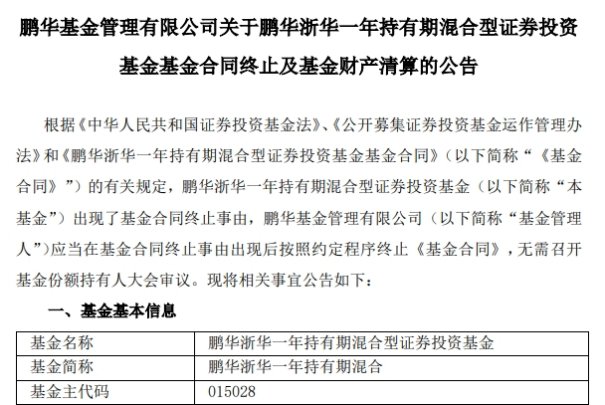 公开资料显示,鹏华浙华一年持有于2022年4月成立,初始规模2亿元,锁定期一年,但解禁不到一年间资产大幅缩水,鹏华基金在《关于鹏华浙华一年持有期混合型证券投资基金基金合同终止及基金财产清算的公告》表示,截至2024年9月9日日终,本基金基金资产净值已连续50个工作日低于5000万,最终根据约定进行清盘。
