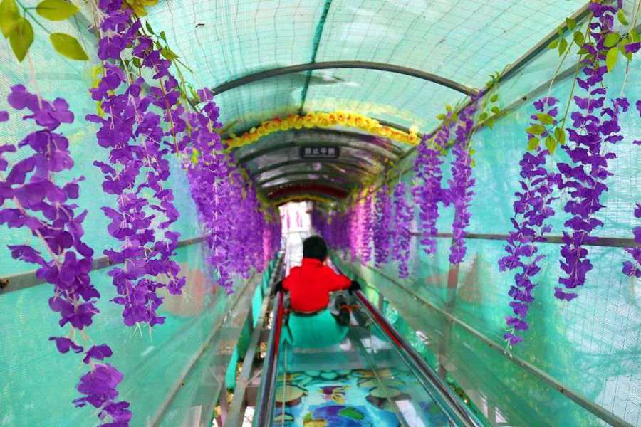 飞云天桥与玻璃滑道;站在飞云天桥上,脚下是万丈深渊,却能将壮美山色尽收眼底;玻璃滑道则带来风驰电掣的刺激,在欢笑与尖叫中穿越山林;七彩滑道色彩斑斓,宛如天边的彩虹坠落人间,从顶端飞速滑下,享受速度与激情。