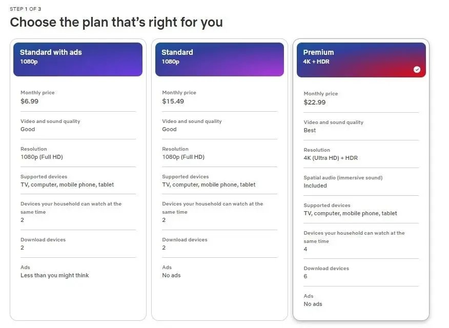 值得关注的是,Netflix在推出含广告订阅计划后,很快取消了9.99美元/月的无广的基础订阅,并将会员体系保留为三档:6.99美元的含广告会员、15.49美元的标准会员、22.99美元的高级会员。与此同时,Netflix打击密码共享与低价额外添加账户的模式,也提升了标准会员的转化率。