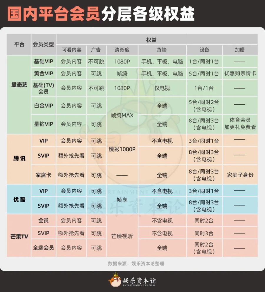 比如,爱奇艺早在2020年就在黄金会员基础上推出星钻会员,除了高清画质,还支持更多设备登录、观看,加赠爱体育会员等高端权益。2022年爱奇艺又在黄金和星钻中间,推出白金会员,享黄金权益之上加了电视端权益。腾讯视频的超级影视VIP、优酷的酷喵VIP,也都是较早开始探索高端用户的溢价空间。