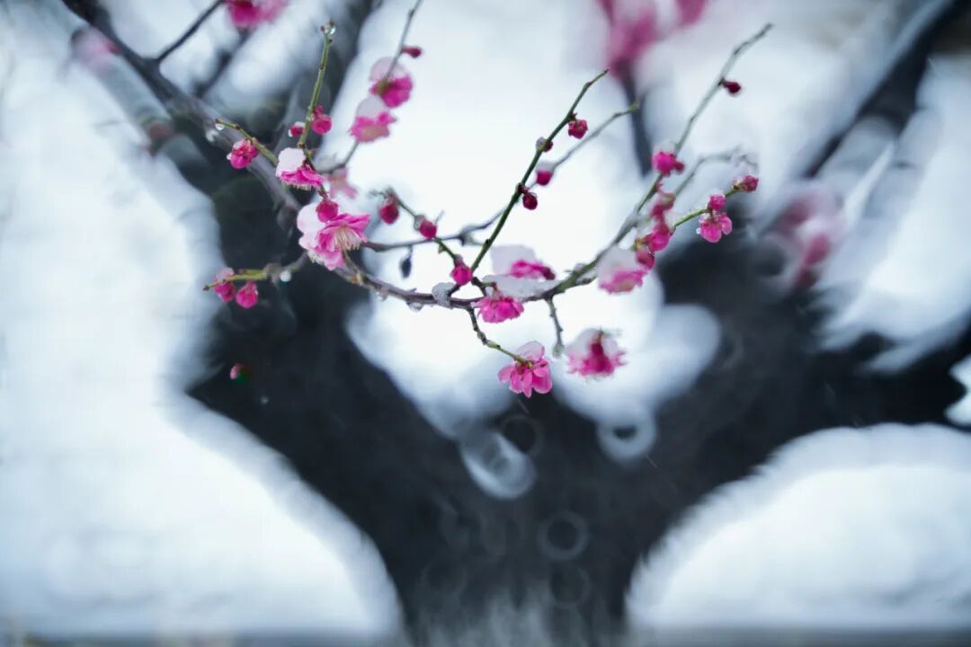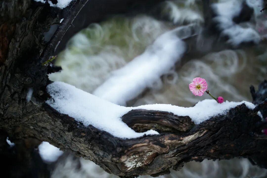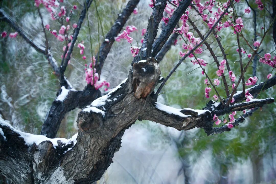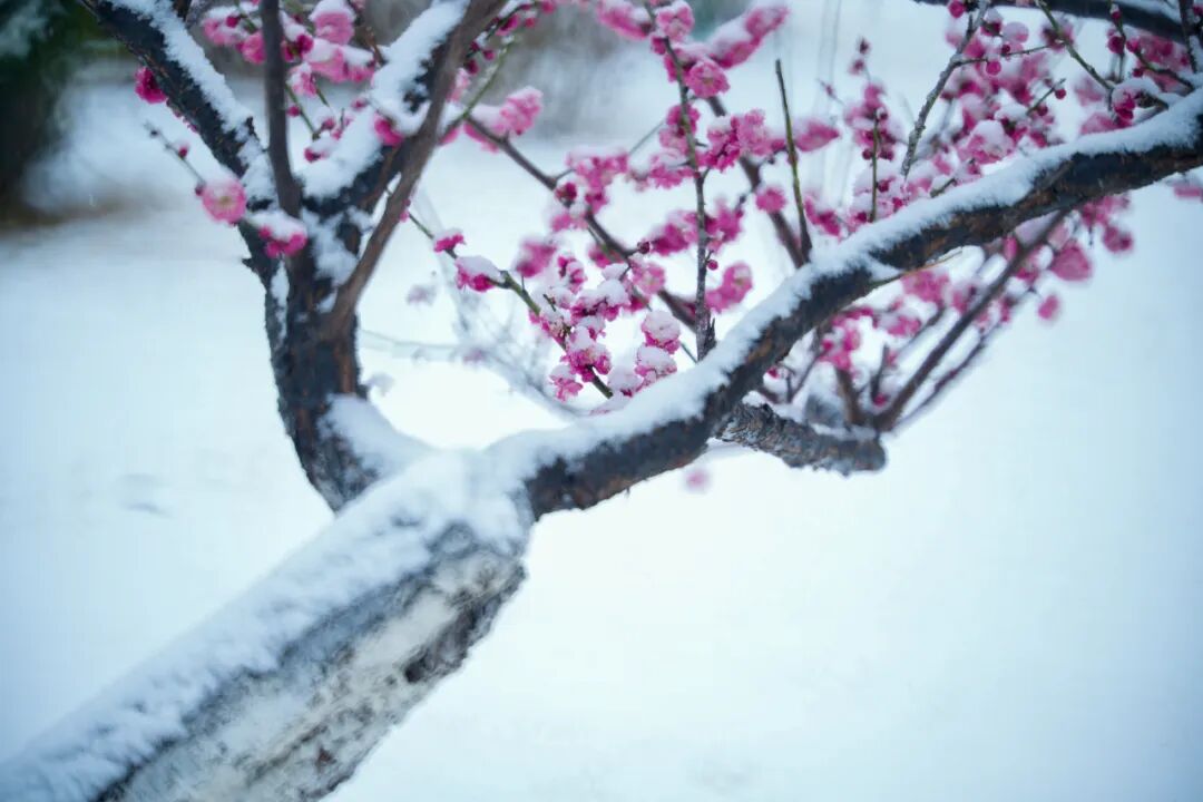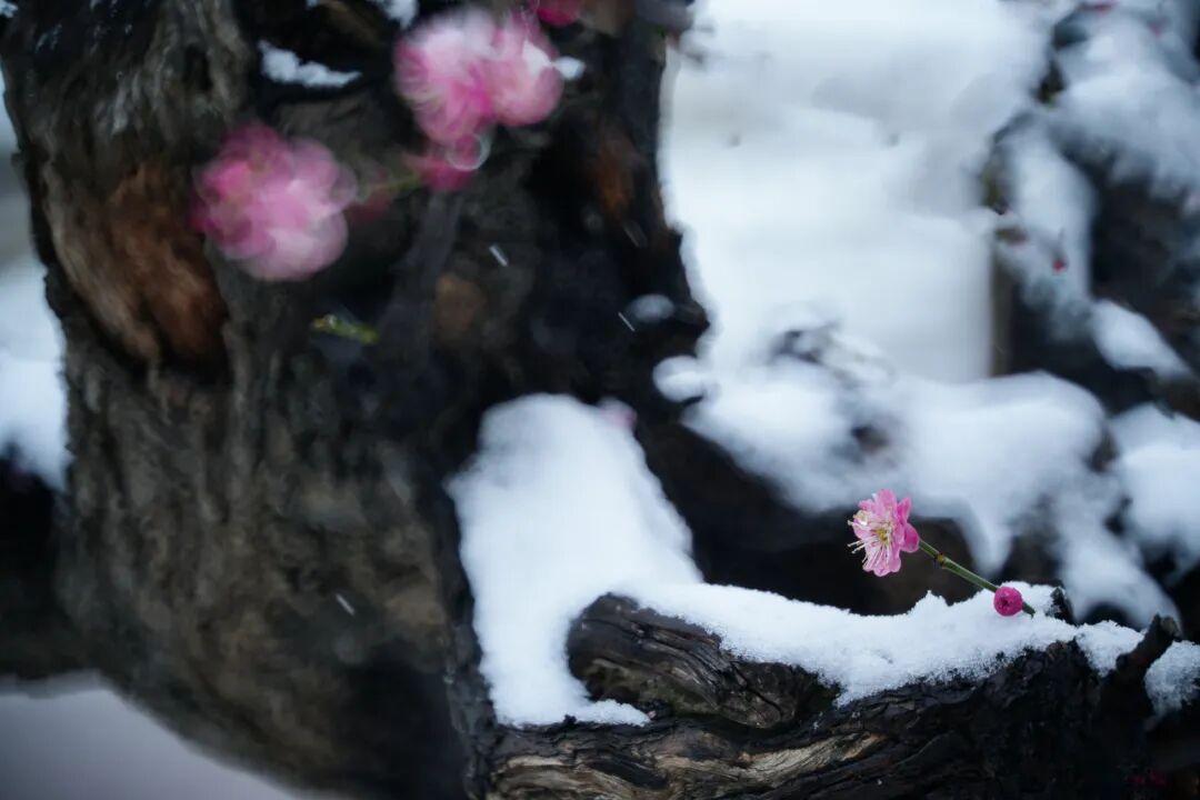 雪花轻轻落在梅枝上,与娇艳的花瓣相互依偎,冷与暖、柔与刚,在此刻奇妙交融。它们不畏惧春雪的清冷,反而在这冰寒中,将生命的坚韧与不屈尽情展现。