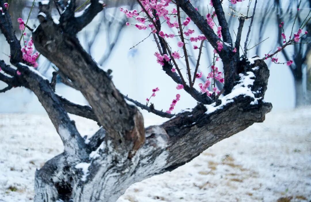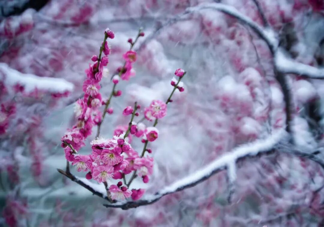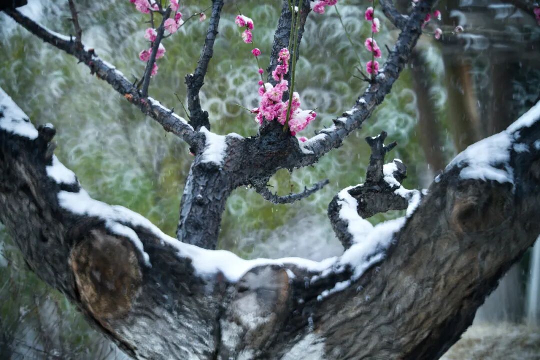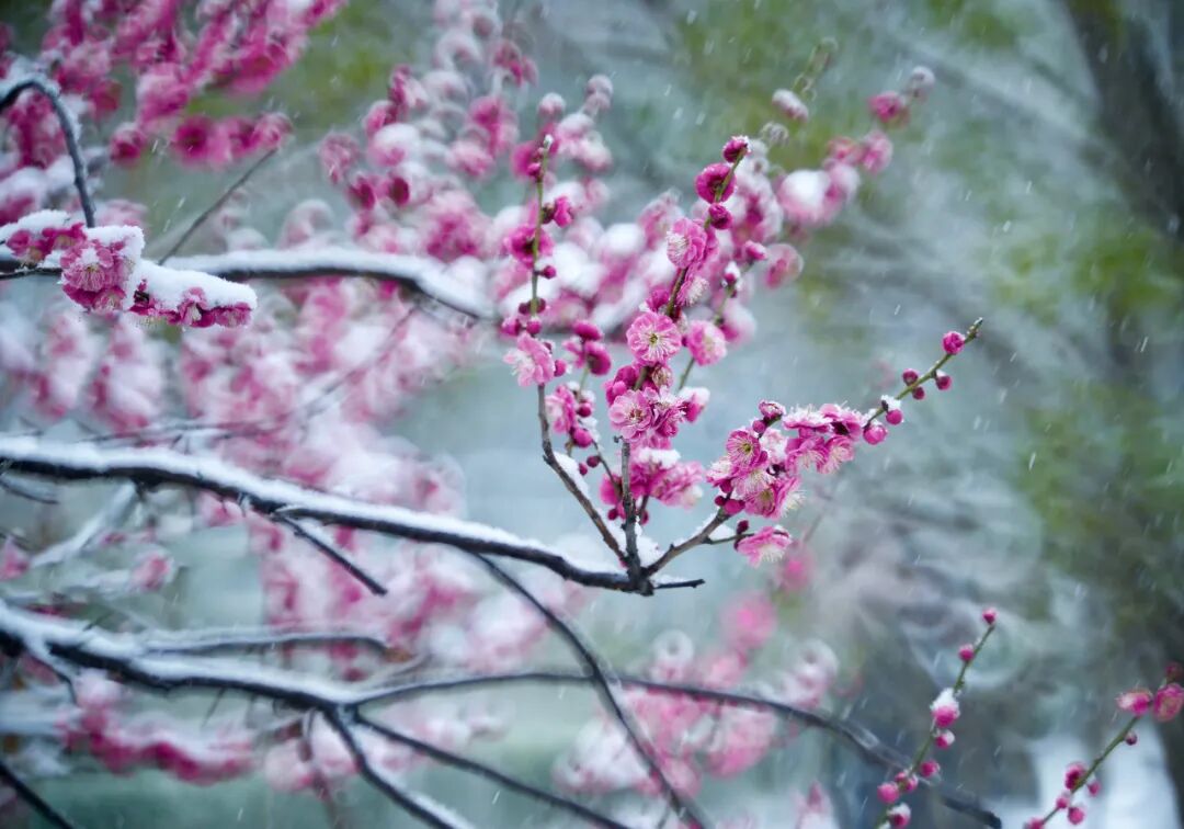 雪花轻轻落在梅枝上,与娇艳的花瓣相互依偎,冷与暖、柔与刚,在此刻奇妙交融。它们不畏惧春雪的清冷,反而在这冰寒中,将生命的坚韧与不屈尽情展现。