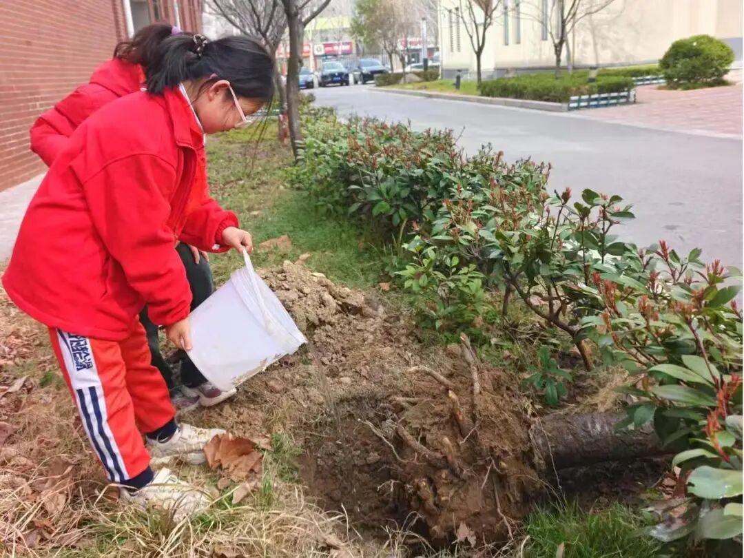 校园里,同学们进行树木浇灌,现场忙碌而有序,气氛热烈而欢快。每一个动作都透露出孩子们对大自然的热爱与尊重,每一滴汗水都凝聚着他们对生态环境的珍视与呵护。