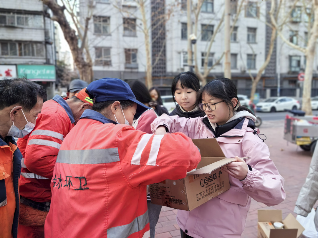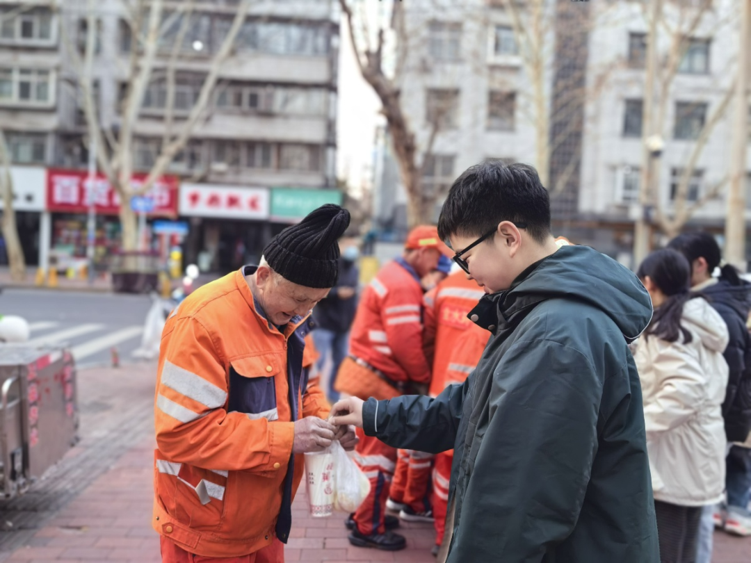 环卫工人的工作日常也令在场学生纷纷动容。参与活动的郑典和张沐瑶说道:“以前觉得城市的美丽环境离不开环卫工人的辛勤付出,现在才知道爷爷奶奶们这么早就要上岗,真是太辛苦了。”“通过这次学雷锋活动,我们学会了尊重与理解,希望这点微光能温暖城市守护者”,郑泽宇和李昊龍一边分发早餐一边争先恐后地说道。