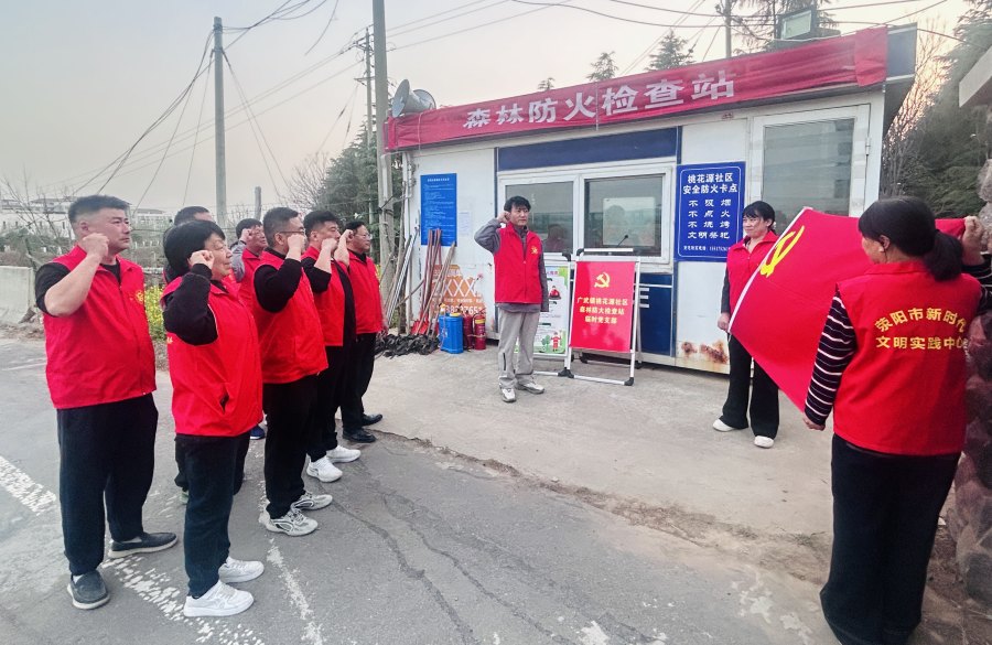 “我志愿加入中国共产党,拥护党的纲领,遵守党的章程……”3月25日,在荥阳市广武镇森林防火检查点临时党支部成立,10名党员重温入党誓词后,迅速投身到紧张的森林防火工作中。巡山、登记来往人员信息、宣传森林防火知识、严禁火种进山,大家轮流值守,以实际行动践行对党的承诺,守护绿色山林。