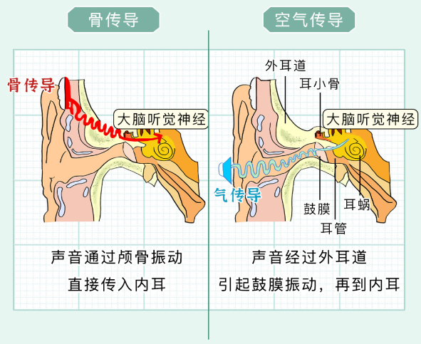 其实,我们平时听到的自己的声音,是通过两种途径传递到耳朵的:一是通过空气传播,二是通过骨骼传导。普通的听觉体验是通过空气传导的方式,声音从外界进入耳朵,经过耳膜的振动,再经过内耳的处理传递到大脑。