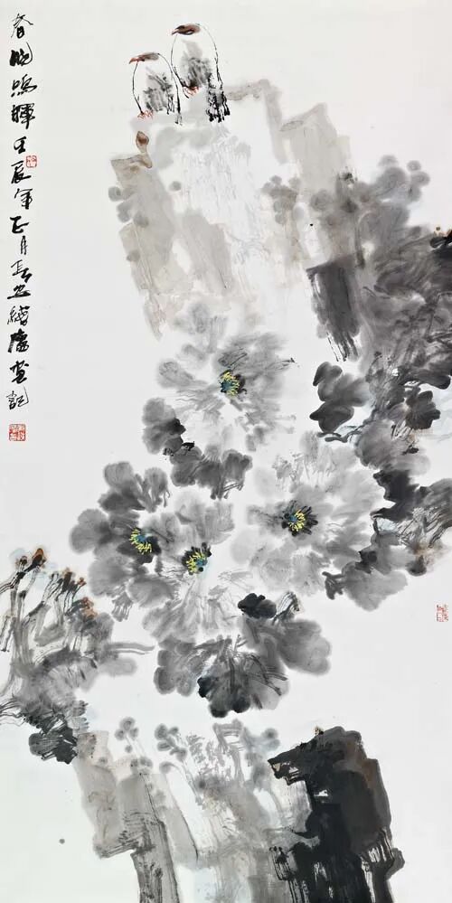 君本深契水墨之道,幼承典范,壮志不移,探笔情于渊源,寻墨意于传统。用笔或枯或润,时散时聚,浓淡交融,虚实互映,如雁影穿林,如云气浮空。尤妙在其“色中之墨,墨中有光”,非以艳饰夺目,实以神采摄心。其章法之妙,不为繁华所缚,不为形式所拘,观者初见,若野色漫染,复凝神省思,乃知其精妙蕴藉,非浮光掠影所能尽窥。