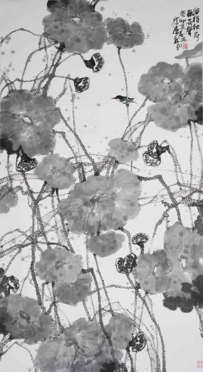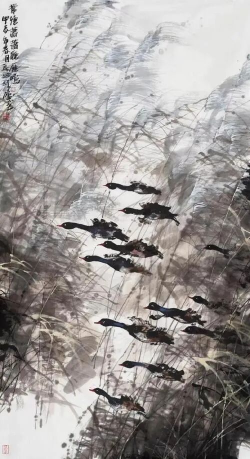 郭君尤长于图式之革。借鉴现代之构成观念,巧融几何形构与水墨章法,使画面既有东方之神骨,复添当代之意绪。其象构不拘于形似,而多于象中寻道;其意象或如梦浮,或似风吟;既见文化根性,又含当代心声。君以“图像为语,笔墨为辞”,一幅一语,一语一心,心归于象,象止于意。