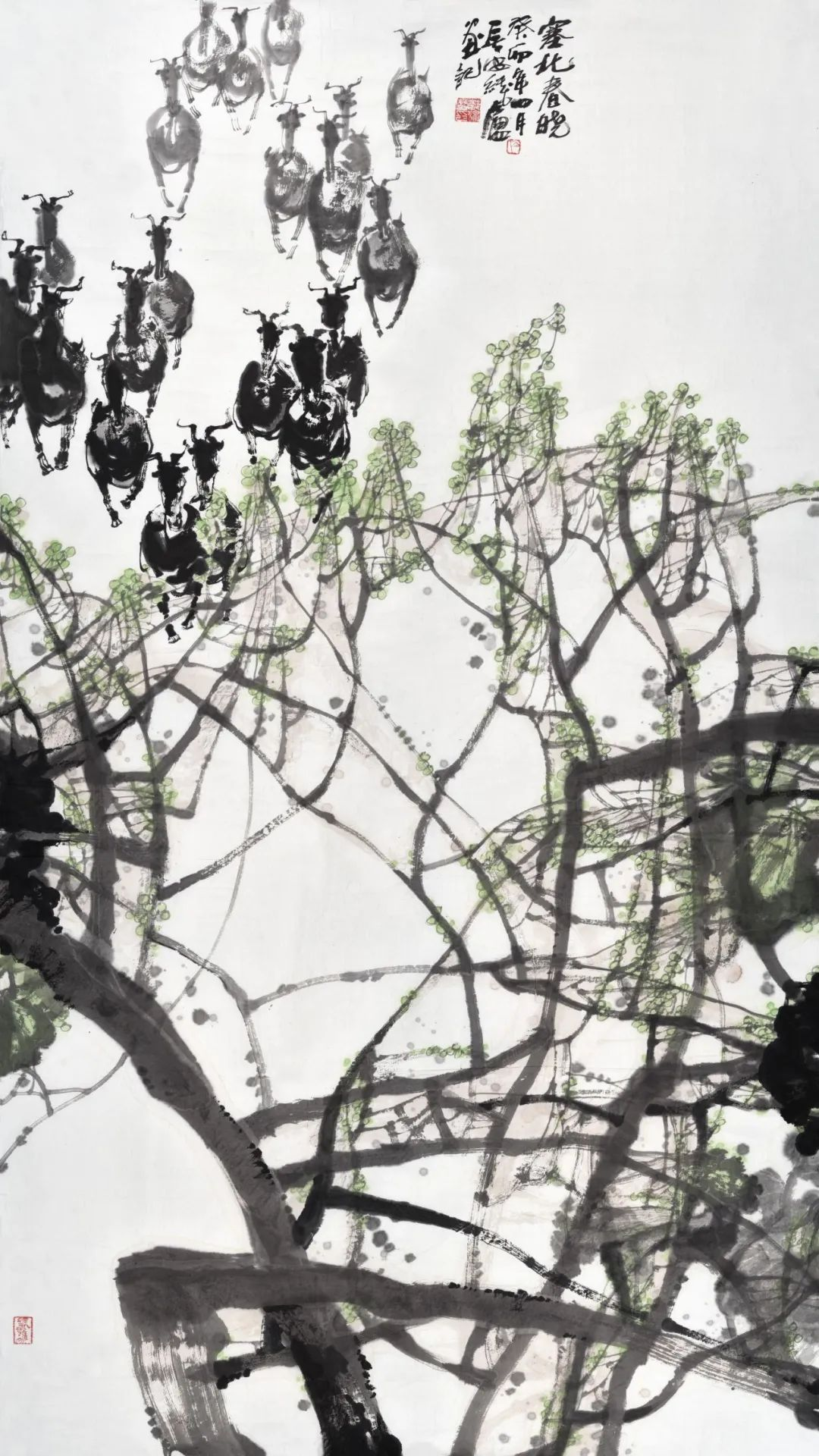 线庐之作,尤重“静”与“动”之调。画面虽静,而意势流动;形象简约,而神思奔涌。其所写山林、禽鸟、寒枝、疏影,多取自然之素淡,不饰雕琢之华采。然其境界,或如暮山远黛,或似寒林静鸣,或若初雪覆枝,皆有一气贯穿,一脉回响。非但写景,实写心境;非仅观物,实观性灵。