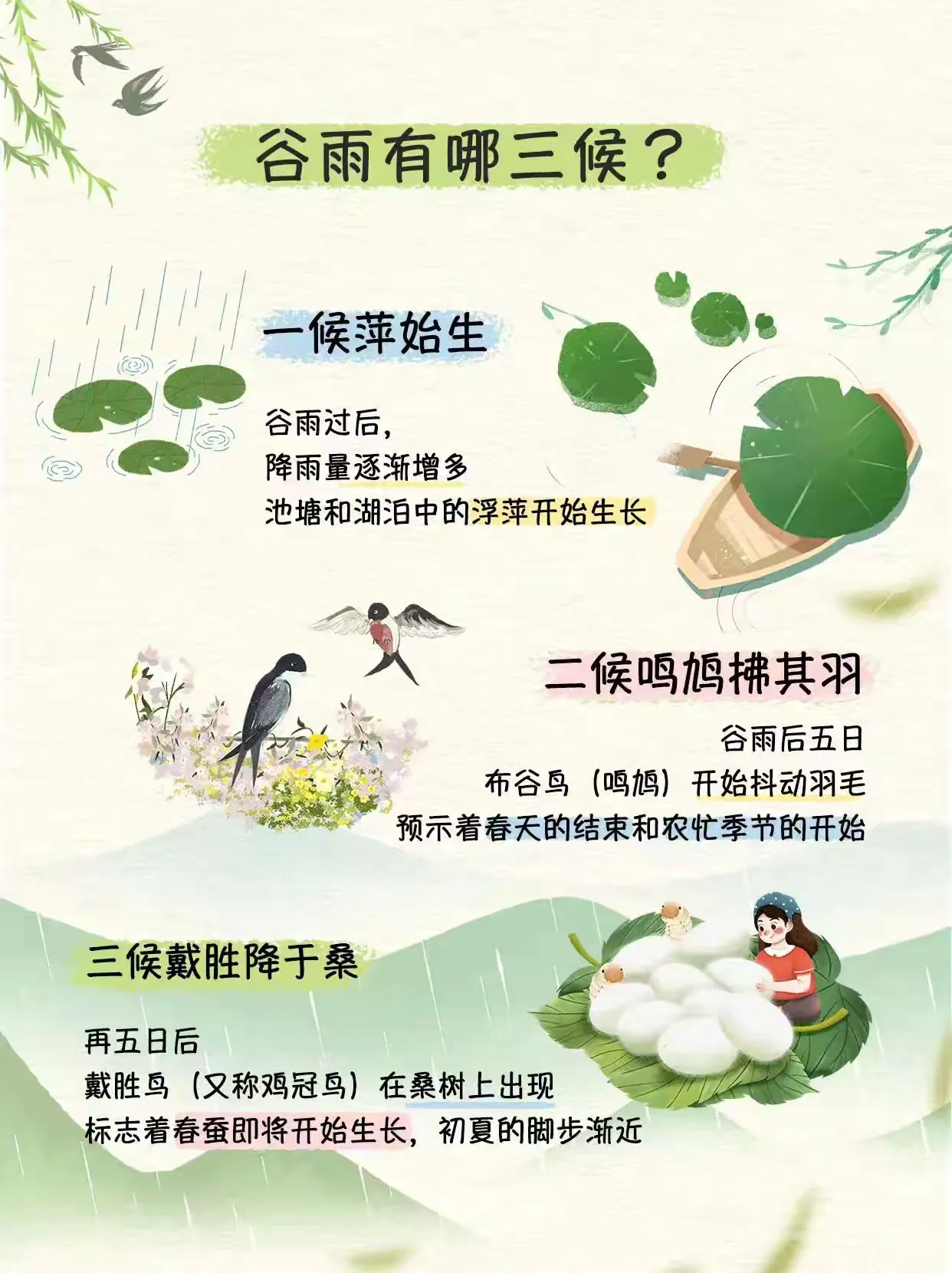 中国古代将谷雨分为三候:“第一候萍始生;第二候鸣鸠拂其羽;第三候为戴任降于桑。”是说谷雨后降雨量💦增多,浮萍🌱开始生长,接着布谷鸟🐦便开始提醒人们播种🌽了,然后是桑树上开始见到戴胜鸟。这时田中的秧苗🌱初插、作物新种,最需要雨水💦的滋润,所以说“春雨💦贵如油”。
