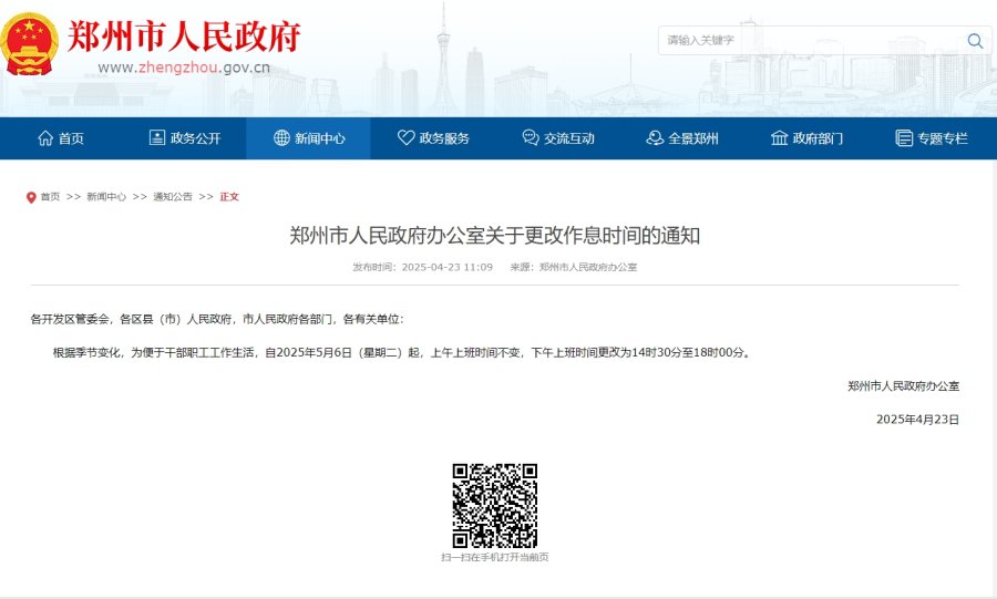 根据季节变化,为便于干部职工工作生活,自2025年5月6日(星期二)起,上午上班时间不变,下午上班时间更改为14时30分至18时00分。
