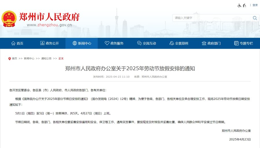 5月1日(周四)至5日(周一)放假调休,共5天。4月27日(周日)上班。