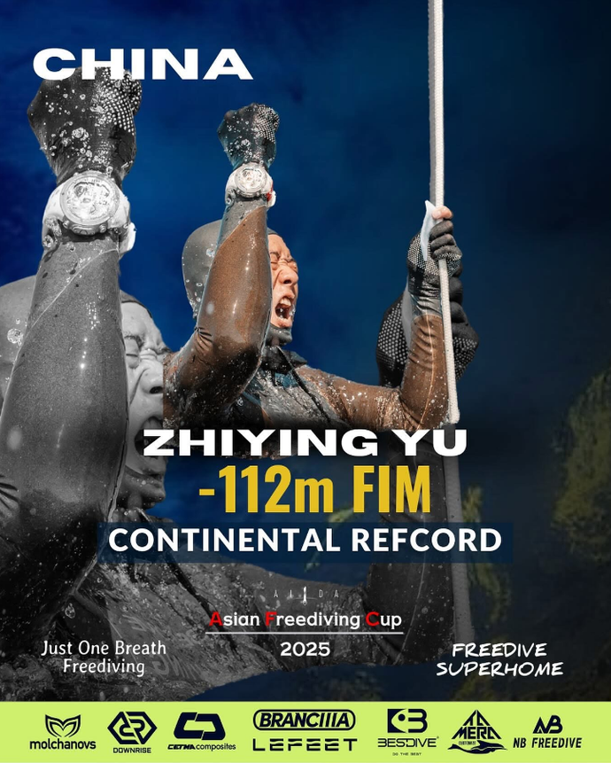 亚洲杯是代表亚洲最高水平的国际比赛。于志瀛曾在2024年6月亚洲杯攻破FIM100米大关,成为该项目第一个破百米的90后,并在2025年三月取得自由潜水全能总分中国第一。2025是他第二次参加亚洲杯,在男子组比赛的第一天,经过认真备赛的他凭借练就的惊人闭气能力与沉着冷静的临场发挥,以一口气潜入大海112米的成绩一举打破了由王瑾(三豆)保持的111米FIM亚洲纪录,成为亚洲冠军。