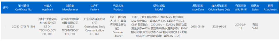 据中国质量认证中心官网,大疆于2025年5月26日获得了一款扫拖一体机器人(具有真空吸尘器功能)的产品认证,这或许就是大疆即将出售的那款新产品。从产品认证信息上还看不出该产品与其他扫地机器人,在功能上与其他扫地机器人有何区分,也没有其他具体参数可以用来比较,目前大家还是在大疆已有的技术基础上进行猜测。