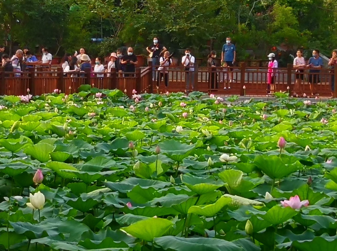 “一园风光半园水,一湖荷花两岸柳。”位于东园的东湖,宛如紫荆山公园的眼。2012年,东园东湖实施改造,建成亭、榭、亲水平台若干,湖中遍植荷花,目前共有9000余株荷花、7大观赏区域、5个大型景点,每年六七月间,西湖王莲似玉盘浮在水面,东湖满眼荷花亭亭玉立,紫荆梅苑睡莲艳丽优雅,市民不惧桑拿天齐聚赏荷,呈现出一幅人与自然和谐共生的美好画卷……