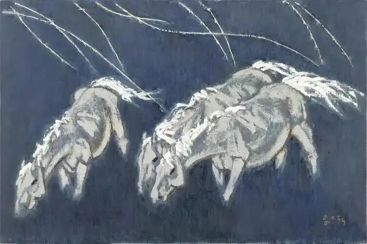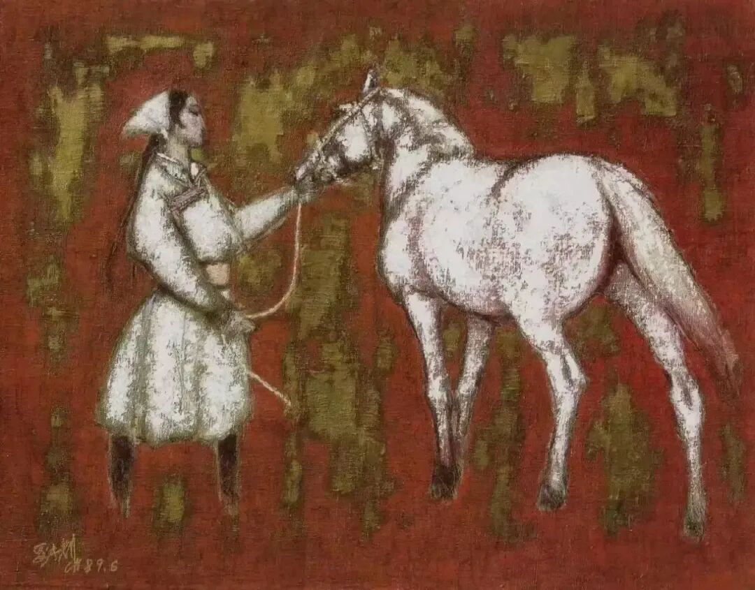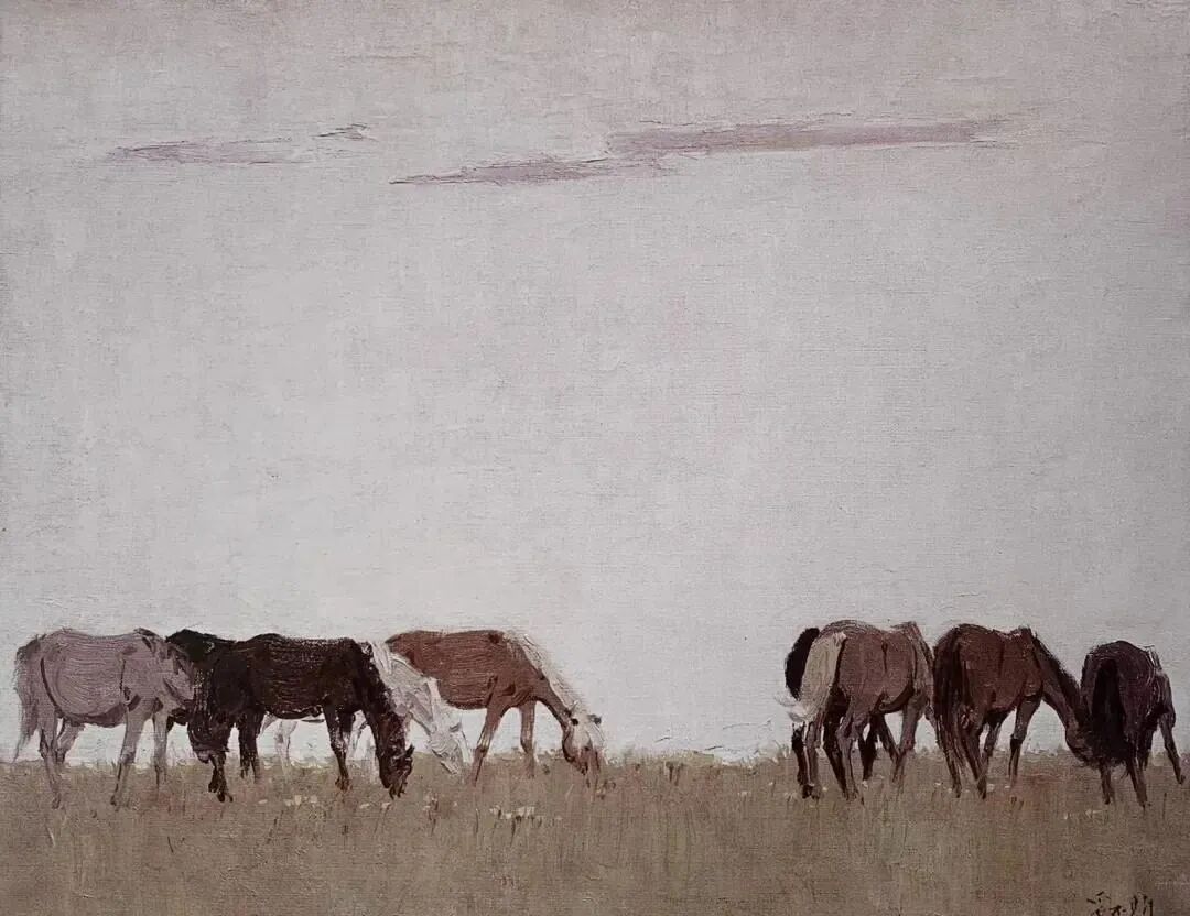 其笔下之人,皆骨肉具存;其马之形,乃魂魄相系。草原妇人,端庄自立,不附权势;牧野骏马,雄健桀骜,不失本性。画之合者,形影相生,意象纷披。观其构图,既不求华饰,亦不滥刻繁态;但求性情之和,意趣之真。譬如马之静卧,非拘笔以图;譬如妇之凝神,非饰态以媚。画之于此,得其朴实纯然,不离生活肌理,不弃文化之根。