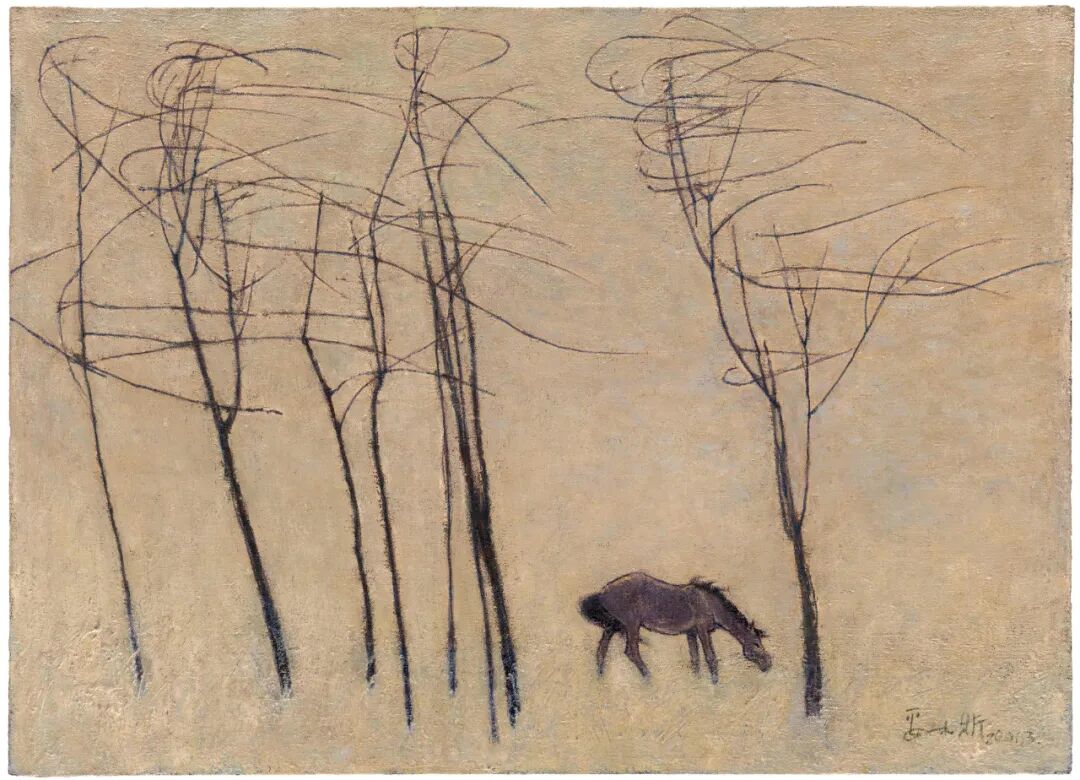 彼之艺,尚节制,贵平衡。主张“无过与不及”,非徒言也。作画数十年,常自省其形与意之和,画面之力与柔之间,线条之收与放之道,皆有深识。风格虽变,而精神不移;语言或异,而根柢未改。画无定式,唯诚为道。其于绘事之志,犹庖丁之于刃,游刃于形骸之外,得意于心手之间。
