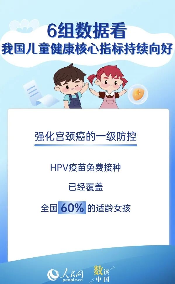 全国8000多所综合医院能够开展儿科门诊服务或住院服务;HPV疫苗免费接种覆盖60%适龄女孩;出生缺陷导致的婴儿死亡率下降30%以上;0-6岁儿童眼保健和视力检查率覆盖达95.4%……