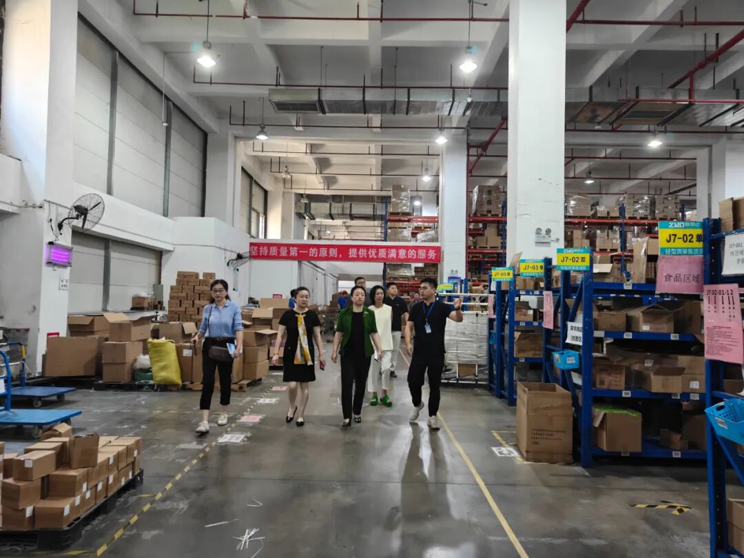 在折扣牛城市批发中心和新华网汽车直播基地,重点调研新零售业态和直播电商的运营模式及市场表现。随后,靳砚杰一行前往园区跨境进口保税仓,深入了解1210保税备货模式。