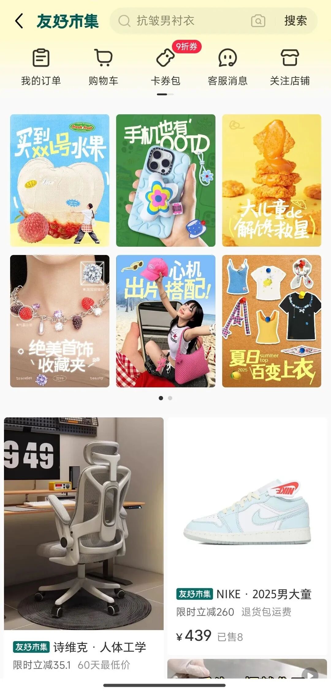 打开小红书的“友好市集”页面,区别于主流电商平台主打 “高效找货”的货架陈列,以及大幅促销 banner等,小红书映入眼帘的则是以兴趣内容为驱动的“创意摊位”,搭配诸如 “买到 XXL 号水果”“手机也有 OOTD” 等充满生活感、社区特色的海报式封面。