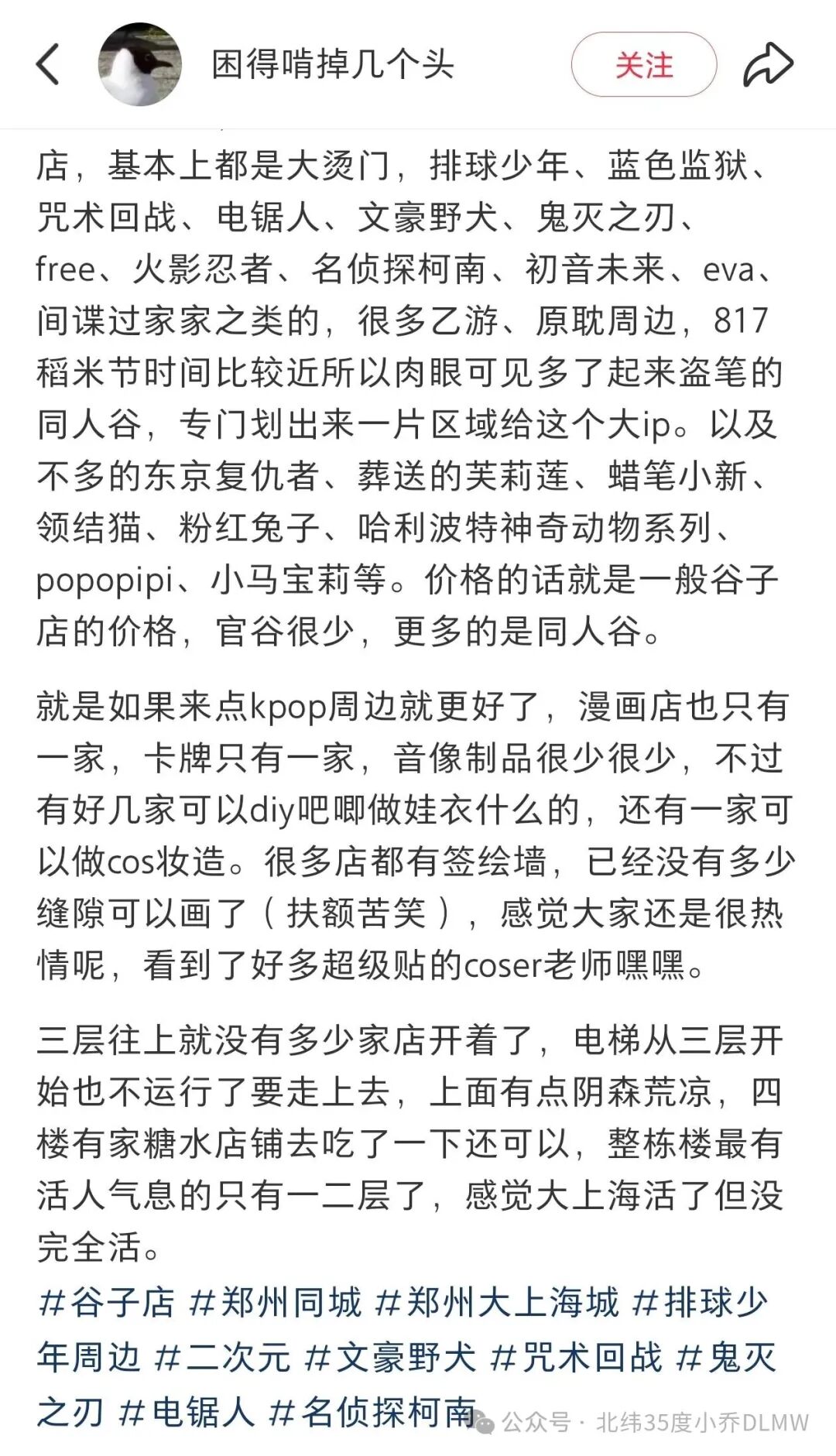 随着郑州的二次元年轻人在这座老商场聚集,大上海城逐渐成为他们一起吃谷、出Cos(Cosplay简称)、摆摊贩卖周边的热门地点。随后,外地二次元爱好者也因小红书、抖音等平台“安利”慕名而来。人气攀升的同时,大上海城内的谷子店也越开越多。