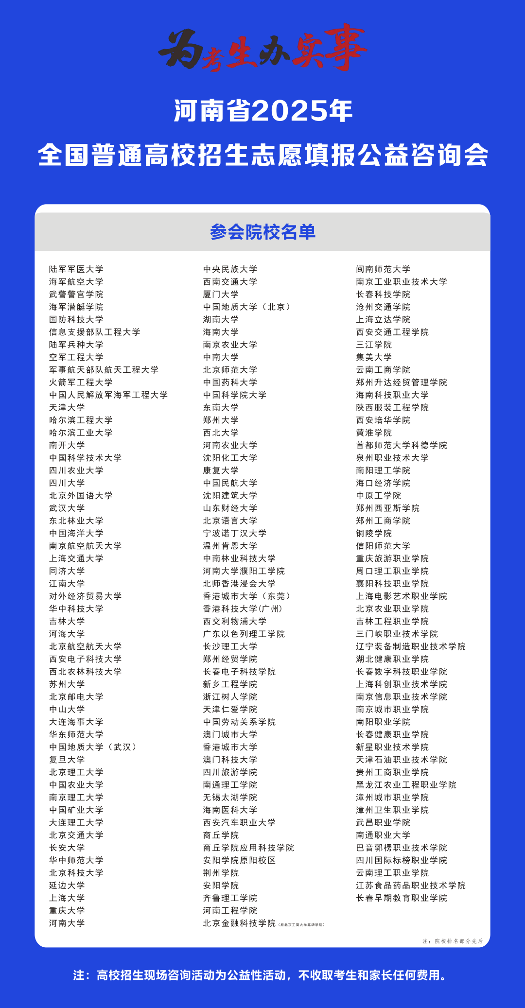 为帮助高考考生及家长更全面地了解高校信息,科学指导考生合理填报高考志愿,助力考生圆好大学梦,由省内外百余所高校共同参与的“为考生办实事”主题公益活动——河南省2025年全国普通高校招生志愿填报公益咨询会将于6月25日上午8:30-11:30,在郑州市第七高级中学开展,现场将有百余所高校面对面为考生提供细致的公益咨询服务,敬请高三毕业生及家长参加!
