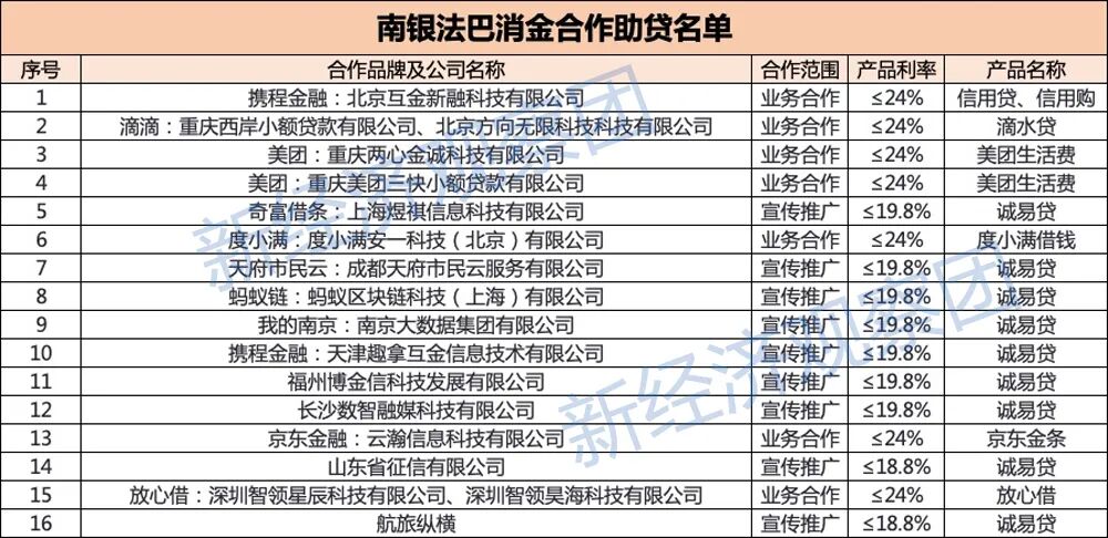南银法巴消费金融有限公司也在官方APP的信息披露入口内,公布了16家合作机构的名单,其中9家合作方式为“宣传推广”,利率大部分为19.8%以下,7家为“业务合作”,利率为24%以下。