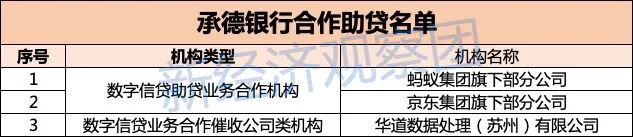 承德银行的助贷合作名单是目前已公布信息中最为简单的一家,仅选择了蚂蚁和京东两家巨头,以及催收机构华道数据。