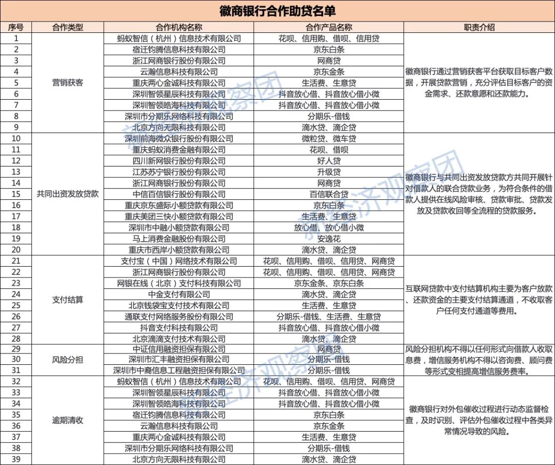 相对而言,徽商银行披露的信息则比较详细,既有合作机构名单,还覆盖了对应产品,以及徽商银行职责内容。合作机构共有39家,分为营销获客机构、联合贷合作机构、支付机构、融担机构和催收机构,囊括了市场上互联网大厂平台、主流助贷平台以及头部民营银行。