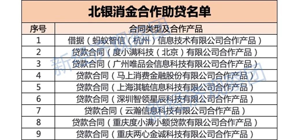 北银消费金融有限公司(以下简称“北银消金”)最近也公开披露了最新贷款合同范本。根据附件合同显示,北银消金的合作助贷名单中,包括蚂蚁集团(花呗、借用购、借呗、信用贷)、度小满(有钱花)、唯品会(唯品花)、马上消费、奇富科技(奇富借条)、京东科技(京东金条)、抖音放心借、美团(生活费、生意贷)等,多数为头部互联网平台。