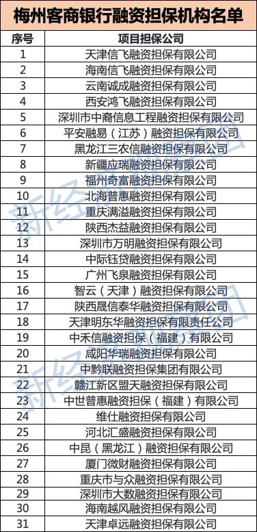此外,梅州客商银行还公布了31家融资担保公司。有一部分是合作获客平台的关联公司,另外一部分则为地方担保机构。